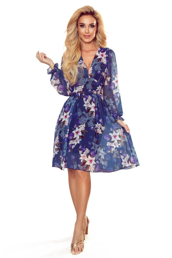 • FRANCES – sukienka szyfonowa z długim rękawem | granatowa w kwiaty